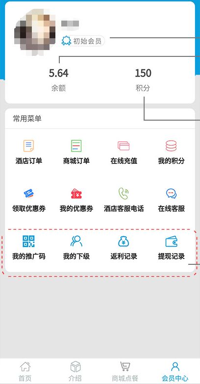 可按会员等级给予折扣价及灵活的充值方式,采用积分制度,通过订房获取的积分可以兑换商品、优惠券、房间。另有分员分销,推荐给好友订房获取佣金,获取到的佣金可以提现或者充值到自己的余额里。